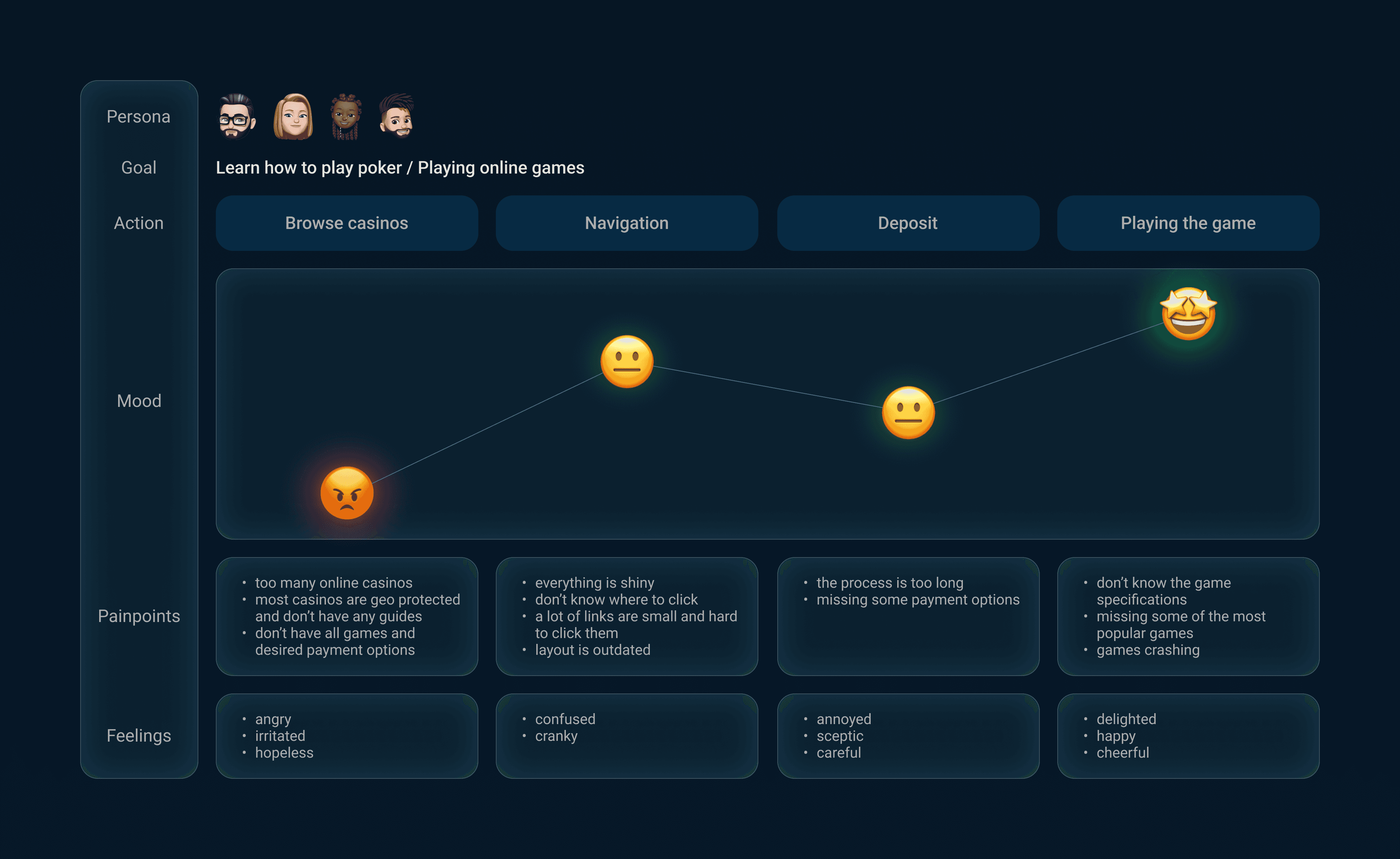 I’ve created the user journey map to identify all the pain points and feelings that players might go through while using the product.